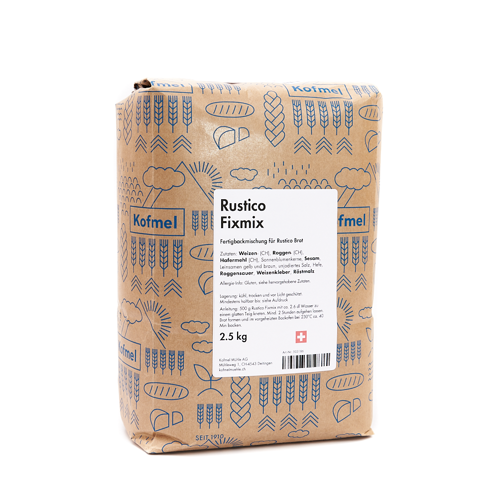 500 g Rustico Fixmix mit ca. 2.6 dl Wasser zu einem glatten Teig kneten. Mindestens zwei Stunden aufgehen lassen. Brot formen und im heissen Backofen bei 230°C ca. 40 Min. backen.